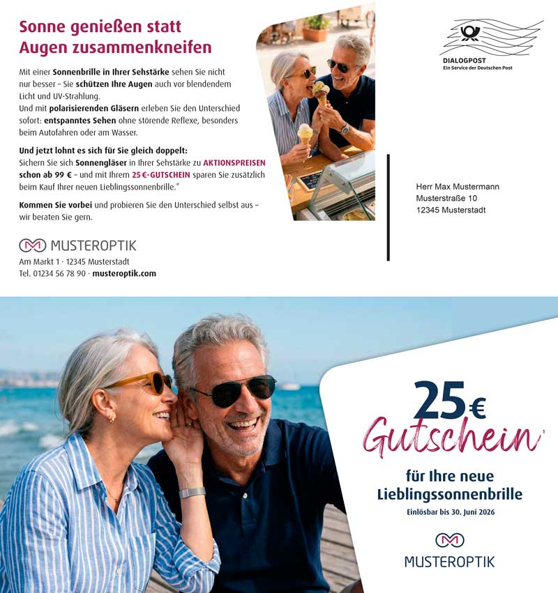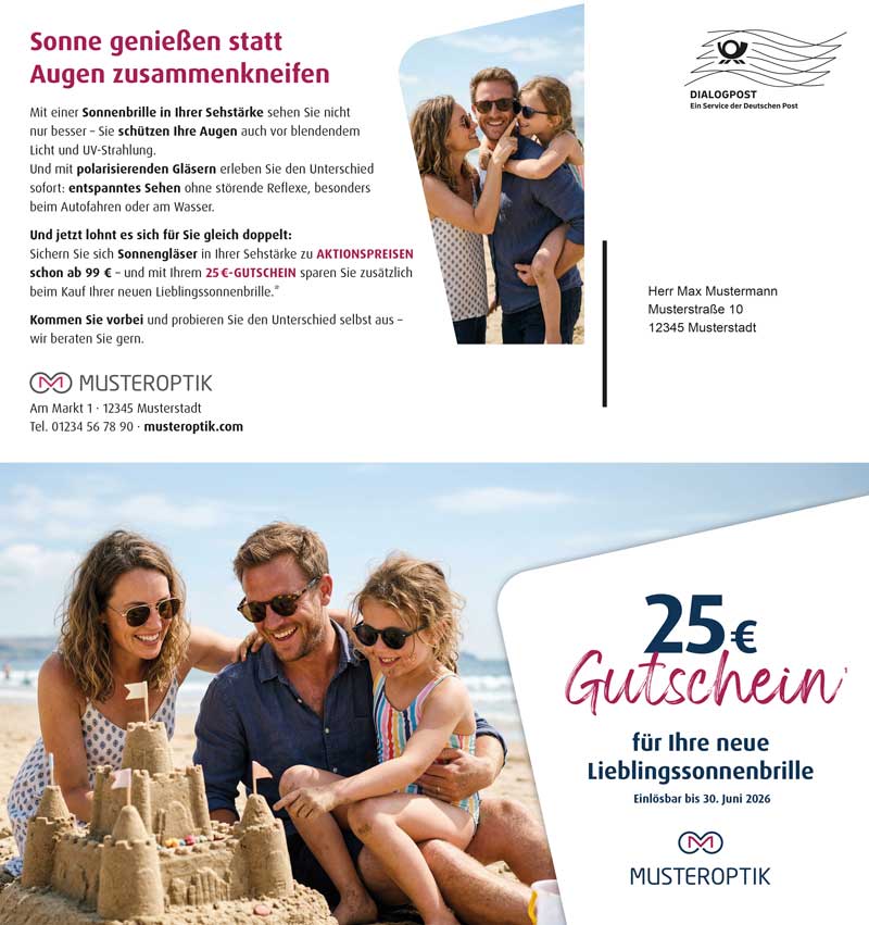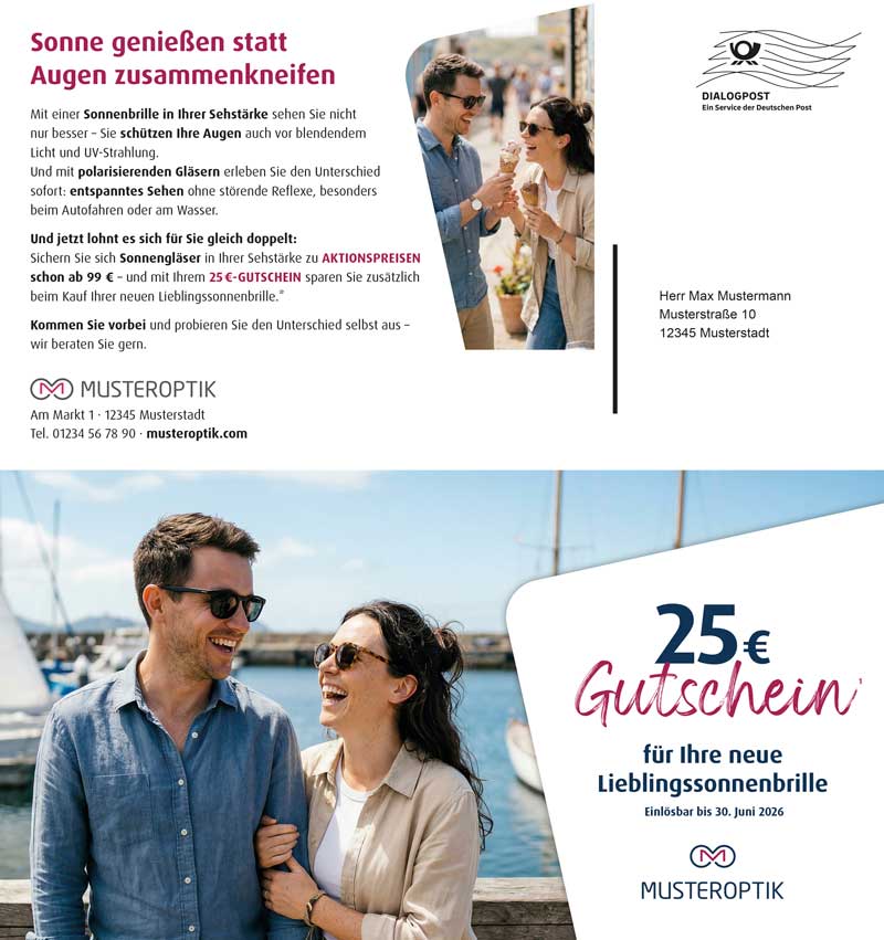 Holen Sie Ihre Stammkunden direkt vor der Sonnenbrillen-Saison ab! Mit dem vierseitigen Selfmailer im Maxiformat erreichen Sie Ihre Kundschaft per Dialogpost – individuell, professionell und ohne Aufwand.